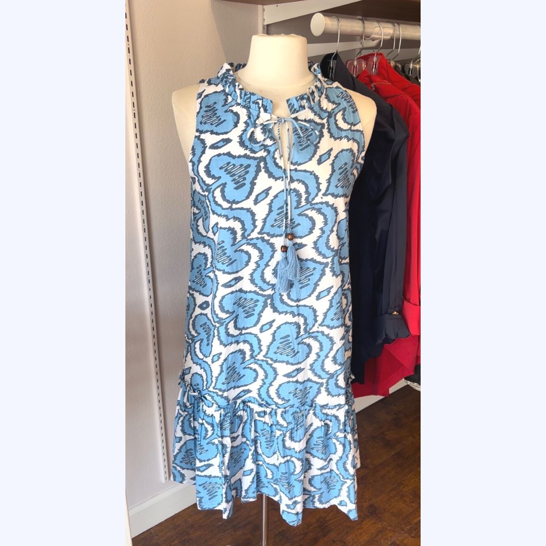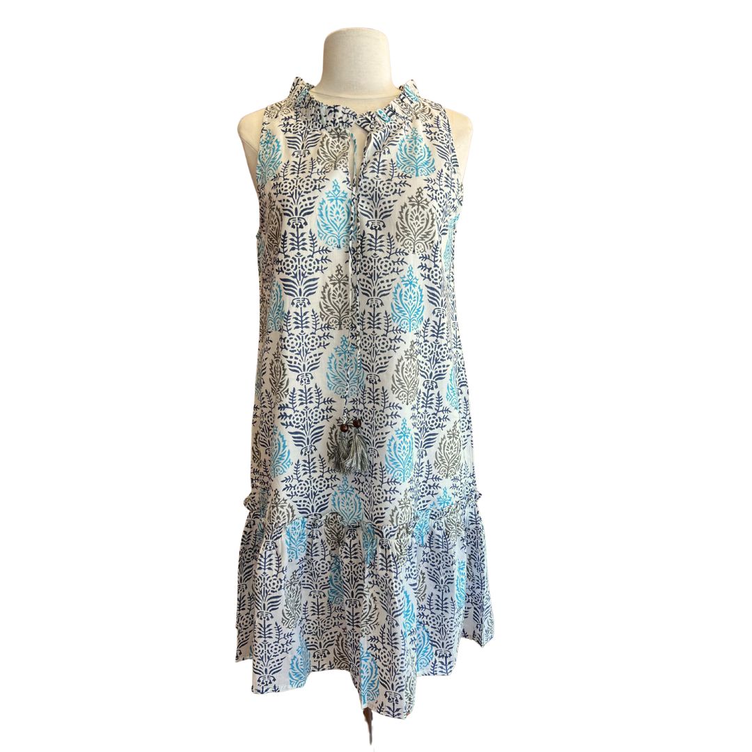 Sleeveless Blue & White Dress With Tassel Tie Neckline