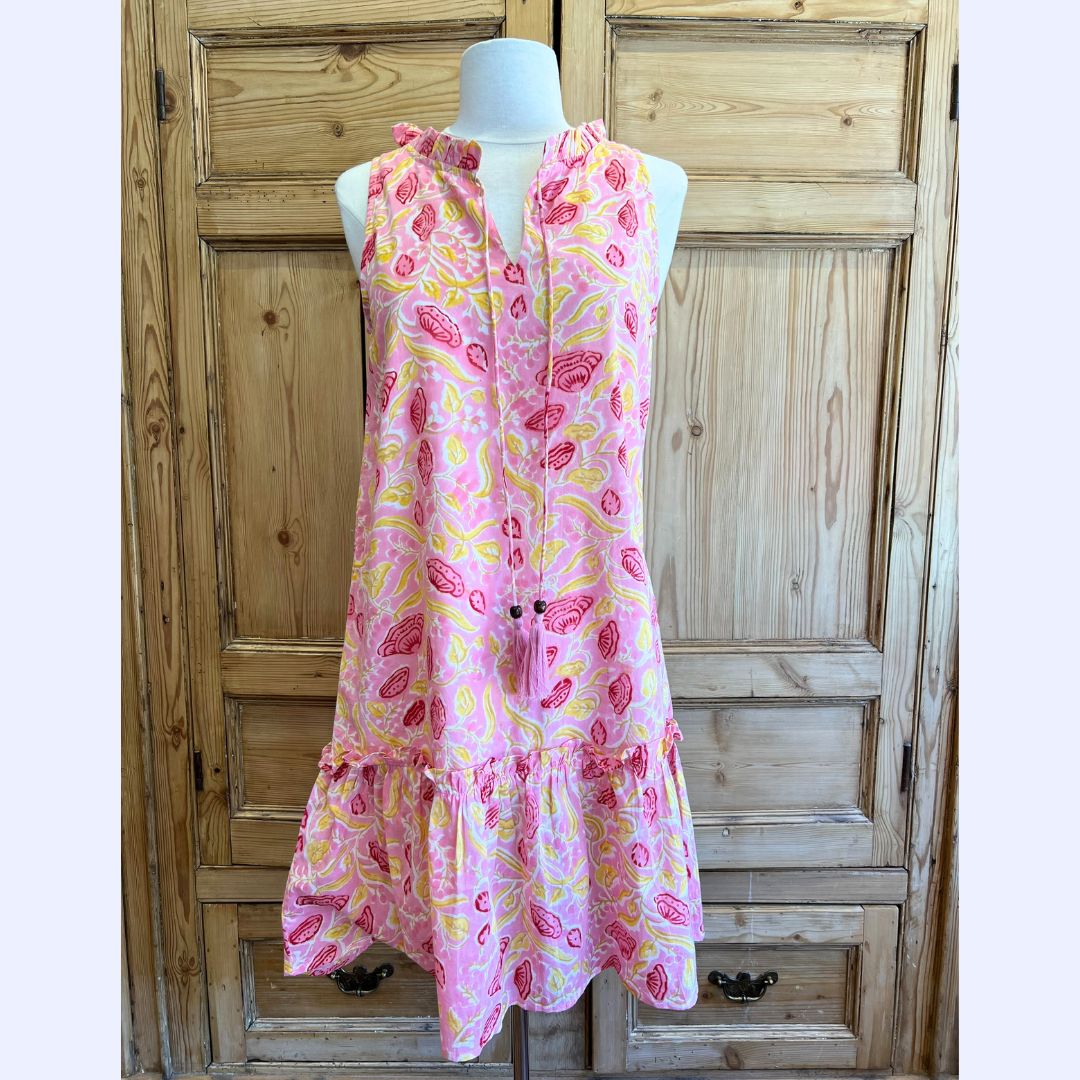 Sleeveless Pink & Yellow Floral With Tassel Tie Neckline
