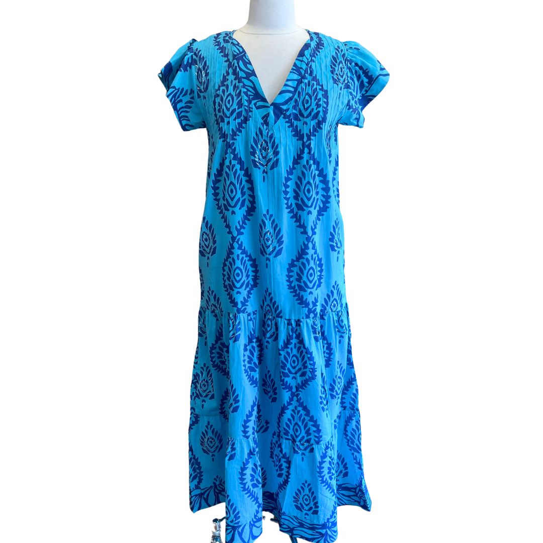 Long Turquoise V-Neck Pin Tuck Dress