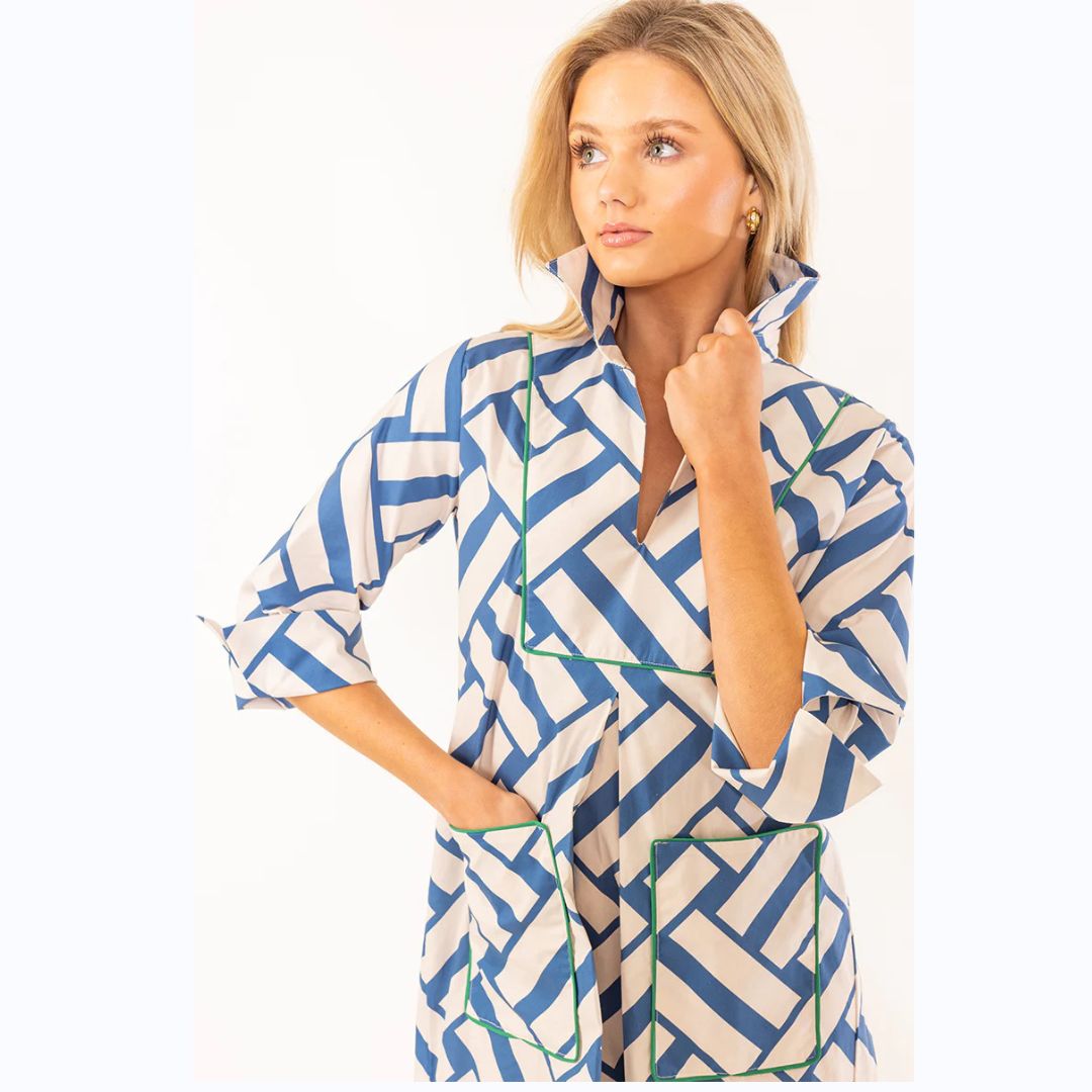 The silhouette is a true A-line that skims the body with effortless ease. An oversized butterfly collar and front patch pockets add character, while contrast piping and lined detailing elevate the whole look with a sense of polish and intention.