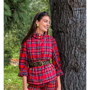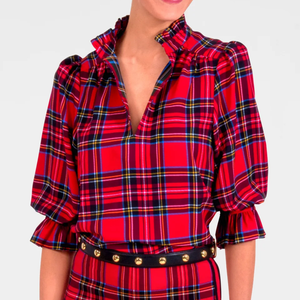 Love! Love! Love this new arrival. This red plaid is so cute and festive, but it's the details of this shirt that make it a stand-out. A ruffle-Mandarin collar that stands up around your neck which is so flattering. My favorite sleeves-3/4 length-another flattering feature on everyone and they end in a soft ruffle. The length is perfect so you can tuck it in or wear it out. The feel of the fabric makes it so comfortable-it would be great to wear all day. This is one of our bestselling styles in any print!