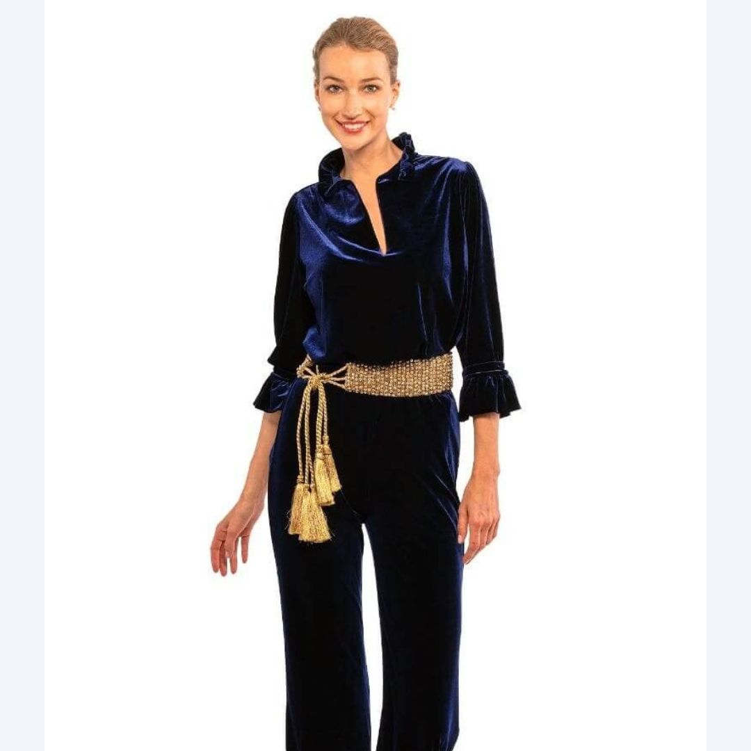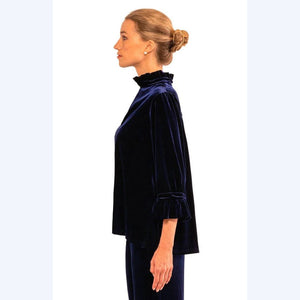 Love! Love! Love this navy velvet version of one of our very favorites!!! I love wearing velvet all winter long-it's so cozy on a cold winter day and it can be dressed up or worn over jeans and look fabulous! This shirt sells out no matter what the fabric or print we get it in! It's the details of this shirt that make it a stand-out. A ruffle-Mandarin collar that stands up around your neck which is so flattering. My favorite sleeves-3/4 length-another flattering feature on everyone and they end in a soft ruffle. The length is perfect so you can tuck it in or wear it out. Perfect for New Year's Eve!!!