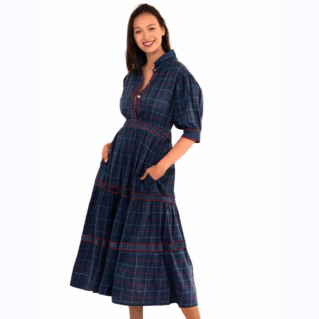 Navy Plaid Long Tiered Dress