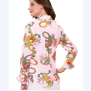 New Arrival! I've been waiting for this shirt to arrive! Look at this amazing, chic dragon print in a fabulous pale pink!!! The tiny fringe on the hem and placket are so on-trend! Pair it with our Fabulous-Fitting jeans in white or a denim wash for a great outfit! Perfect for to take you into Spring and Summer and a crowd favorite at Mah Jongg anytime!!! Get ready for the compliments! You'll love the way you look!